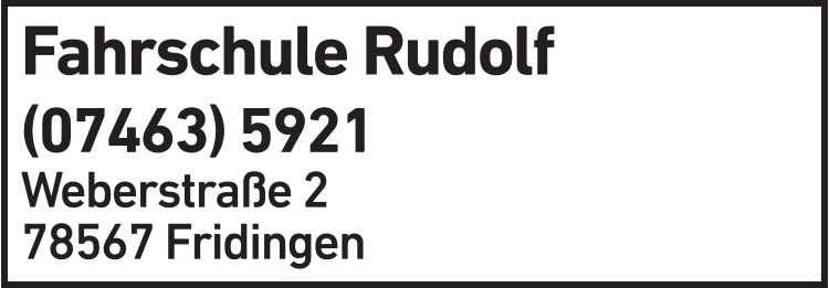 Die Adresse von Fahrschule Rudolf lautet: Weberstr. 2, 78567 Fridingen an der Donau