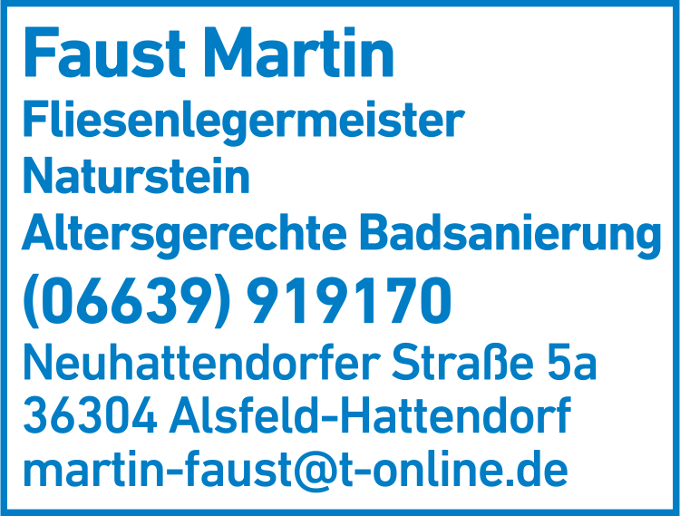 Die Adresse von Faust Martin Fliesenleger-Meister lautet: Neuhattendorfer Str. 5 A, 36304 Alsfeld