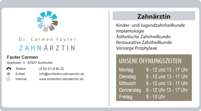Fauter Carmen Dr. bietet Kinder- und Jugendzahnheilkunde, Implantologie, Ästhetische Zahnheilkunde, Restaurative Zahnheilkunde, Vorsorge Prophylaxe, Zahnärztin, Zahnarzt, Zahnärzte, Kinderzahnärztin und Kinderzahnarzt an.