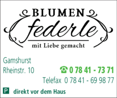 Die Adresse von Federle Blumen lautet: Rheinstr. 10, 77855 Achern