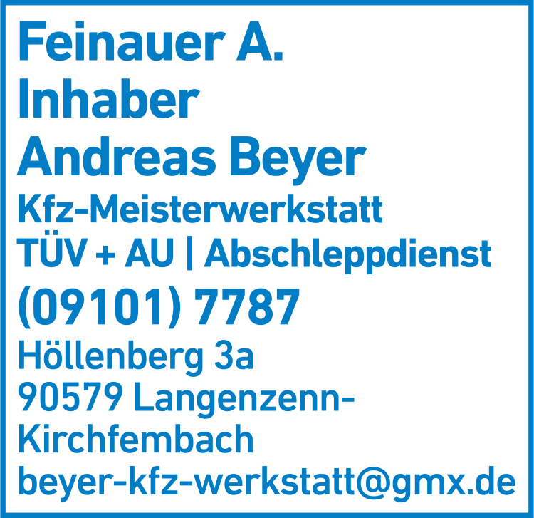 Die Adresse von Feinauer Alfred Inh. Andres Beyer Kfz-Werkstatt lautet: Höllenberg 3 a, 90579 Langenzenn