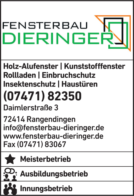 Die Adresse von Fensterbau Dieringer GmbH lautet: Daimlerstr. 3, 72414 Rangendingen