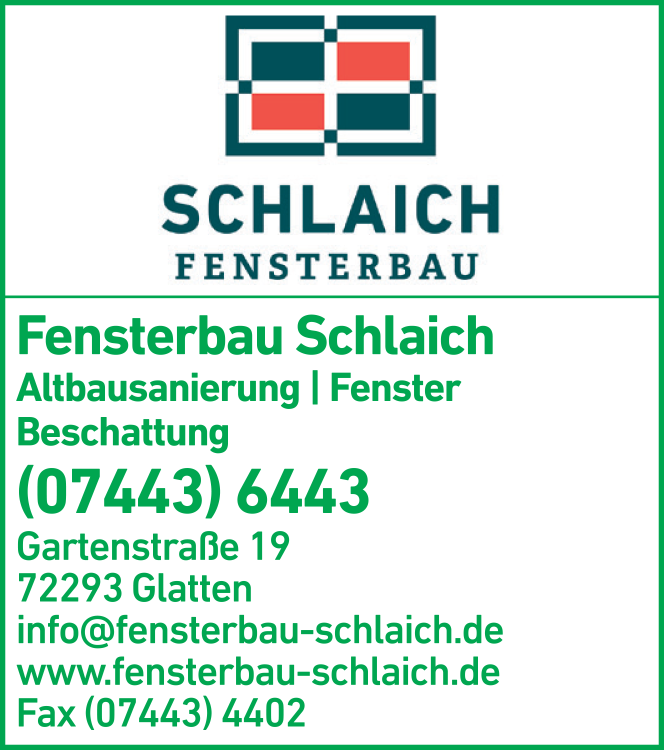 Die Adresse von Fensterbau Schlaich, Inh. Mathias Schlaich Fensterbau/Jalousien lautet: Gartenstr. 19, 72293 Glatten