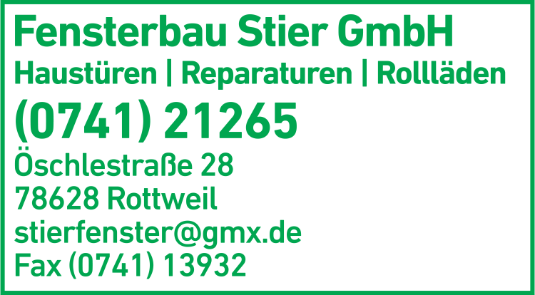 Die Adresse von Fensterbau Stier GmbH lautet: Öschlestr. 28, 78628 Rottweil