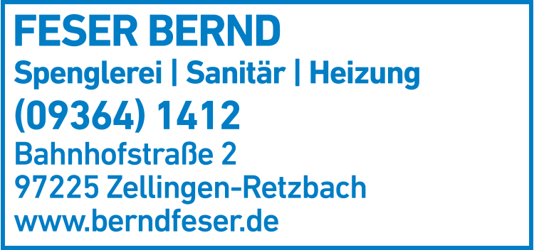 Die Adresse von Feser Bernd Spenglerei lautet: Bahnhofstr. 2, 97225 Zellingen-Retzbach