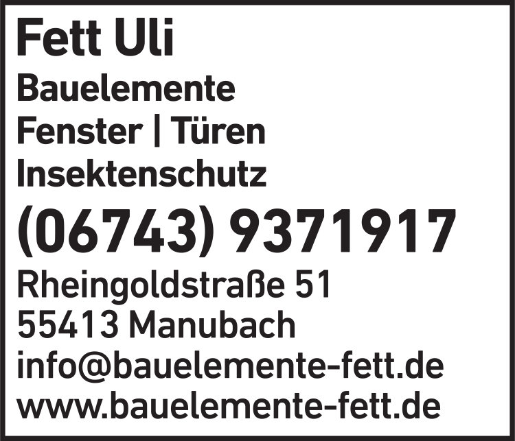 Die Adresse von Fett Uli Bauelemente lautet: Rheingoldstr. 51, 55413 Manubach