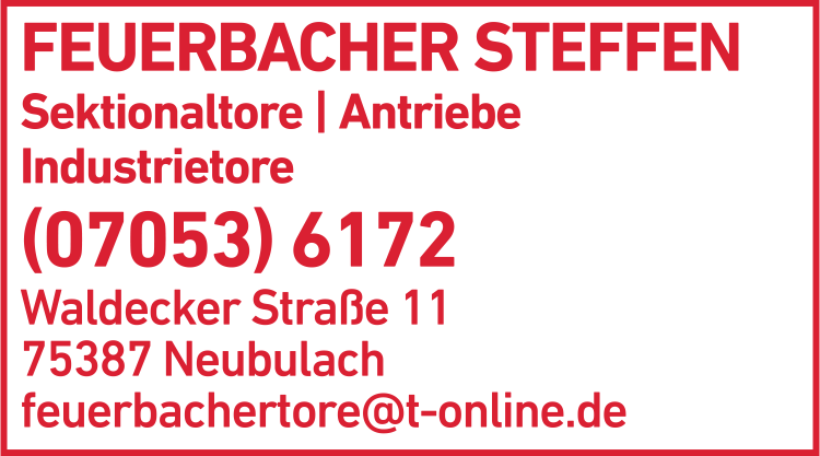 Die Adresse von Feuerbacher Steffen Sektionaltore lautet: Waldecker Str. 11, 75387 Neubulach