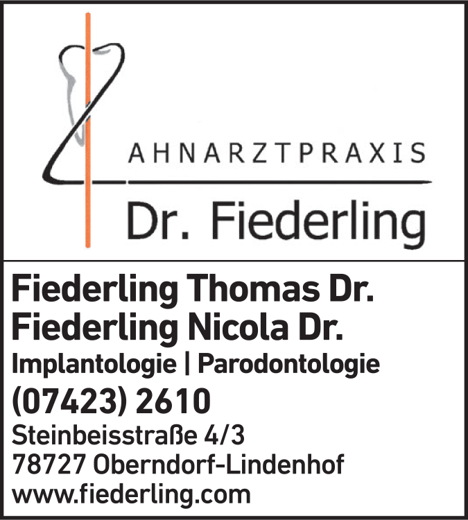 Die Adresse von Fiederling Thomas u. Nicola Dres. med. dent. Zahnärzte lautet: Steinbeisstr. 4/3, 78727 Oberndorf