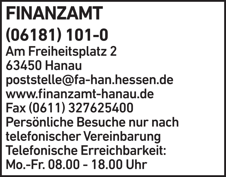 Wie sind die Öffnungszeiten von Finanzamt Hanau?