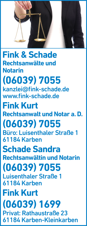 Die Adresse von Fink & Schade Rechtsanwälte und Notarin lautet: Luisenthaler Str. 1, 61184 Karben