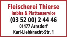 Die Adresse von Fleischerei Thierse lautet: Karl-Liebknecht-Str. 1, 01477 Arnsdorf