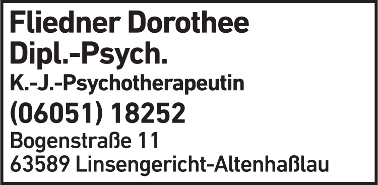 Die Adresse von Fliedner Dorothee Dipl. - Psych. Kinder- und Jugendtherapeutin lautet: Bogenstr. 11, 63589 Linsengericht
