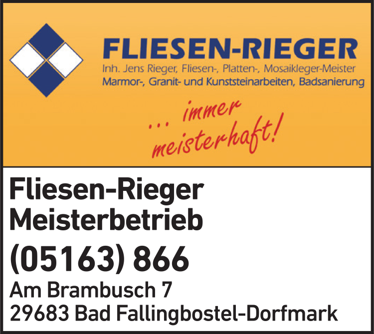 Die Adresse von Fliesen Rieger Meisterbetrieb lautet: Am Brambusch 7, 29683 Bad Fallingbostel