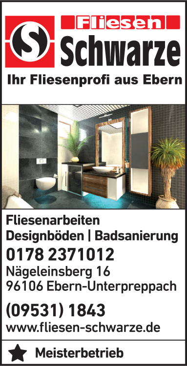 Die Adresse von Fliesen Schwarze lautet: Nägeleinsberg 16, 96106 Ebern-Unterpreppach