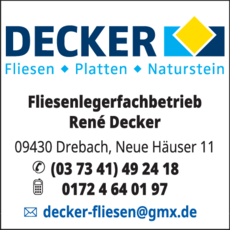 Die Adresse von Fliesenlegerfachbetrieb Decker, René lautet: Neue Häuser 11, 09430 Drebach