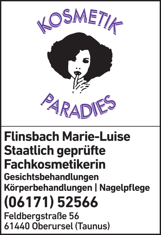 Die Adresse von Flinsbach Marie-Luise Kosmetikparadies lautet: Feldbergstr. 56, 61440 Oberursel (Taunus)