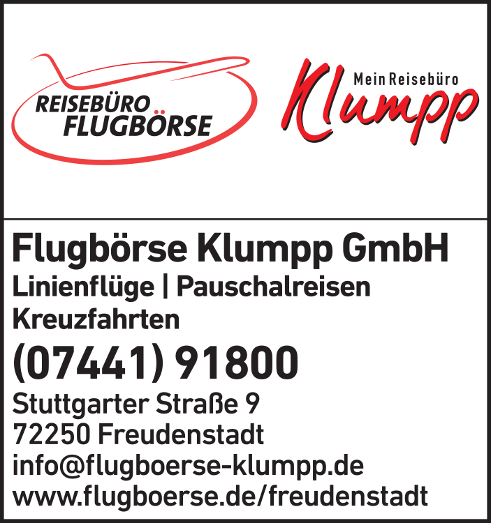 Die Adresse von Flugbörse GmbH lautet: Stuttgarter Str. 9, 72250 Freudenstadt