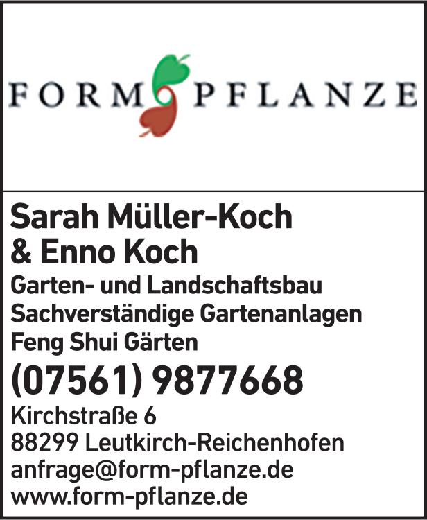 Die Adresse von Form & Pflanze Inh. Sarah Müller-Koch u. Enno Koch Garten und Landschaftsbau lautet: Kirchstr. 6, 88299 Leutkirch