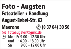 Die Adresse von Foto - Augsten lautet: August-Bebel-Str. 62, 08393 Meerane