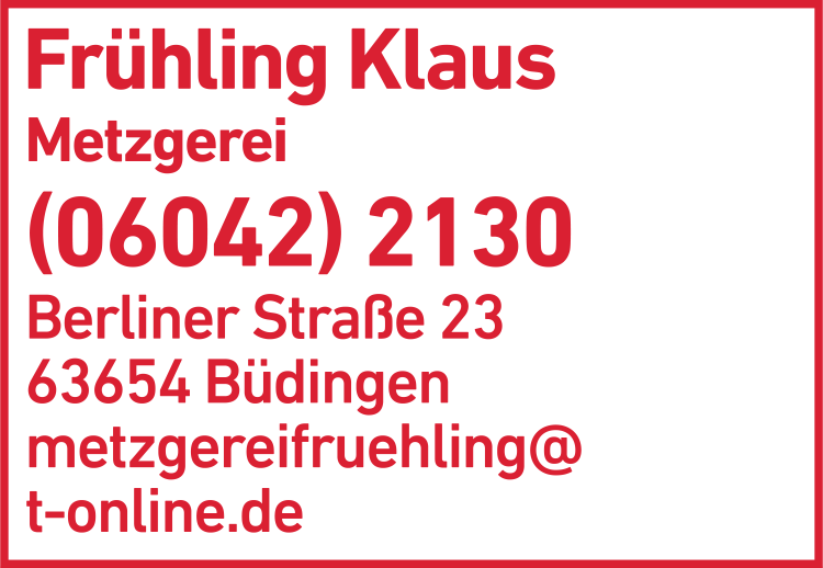 Die Adresse von Frühling Klaus Metzgerei lautet: Berliner Str. 23, 63654 Büdingen