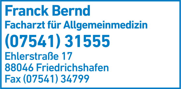 Franck Bernd Facharztpraxis für Allgemeinmedizin 07541 3 15 55 Friedrichshafen Ehlerstr. 17 88046