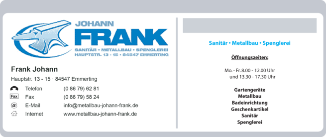 Die Adresse von Frank Johann lautet: Hauptstr. 13, 84547 Emmerting