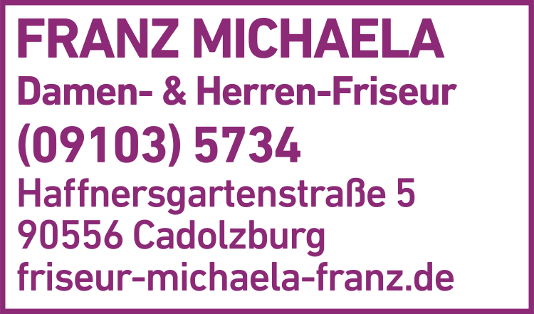 Die Adresse von Franz Michaela Friseursalon lautet: Haffnersgartenstr. 5, 90556 Cadolzburg