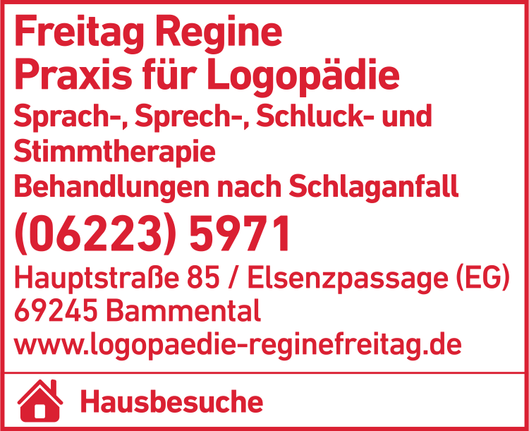 Die Adresse von Freitag Regine Praxis für Logopädie lautet: Hauptstr. 85, 69245 Bammental