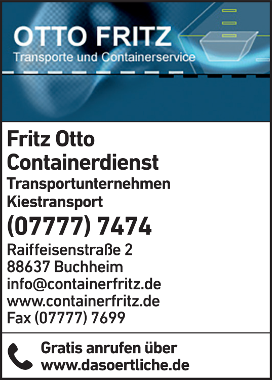 Die Adresse von Fritz Otto Transport + Containerservice lautet: Raiffeisenstr. 2, 88637 Buchheim