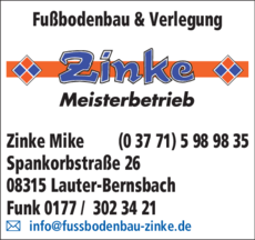 Fußbodenbau Zinke, Mike 03771 5 98 98 35 Lauter-Bernsbach Spankorbstr. 26 08315 Lauter https://ies.v4all.de/0122/OETB/0235/0/9790/70289790_200x100px.png