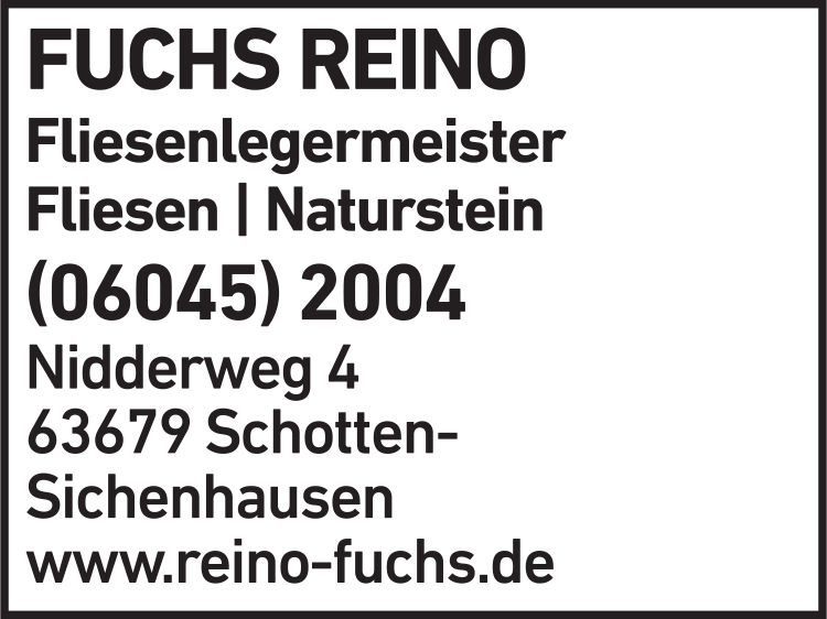 Die Adresse von Fuchs Reino Fliesenlegermeister lautet: Nidderweg 4, 63679 Schotten