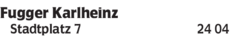 Die Adresse von Fugger Karlheinz lautet: Stadtplatz 7, 84307 Eggenfelden