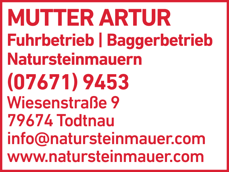 Die Adresse von Fuhr- u. Baggerbetrieb Artur Mutter lautet: Wiesenstr. 9, 79674 Todtnau-Brandenberg