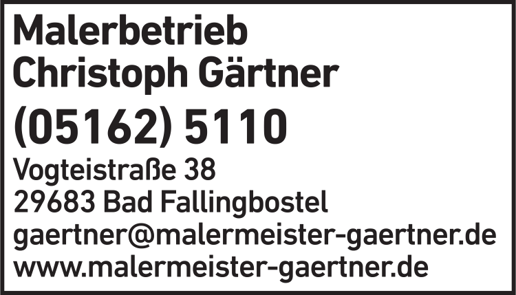 Die Adresse von Gärtner Christoph Malerbetrieb lautet: Vogteistr. 38, 29683 Bad Fallingbostel