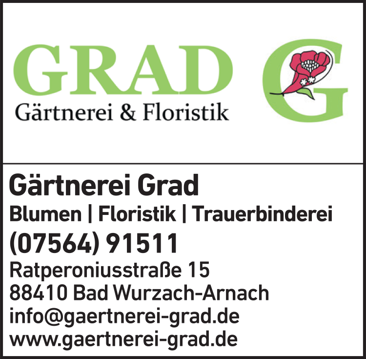 Die Adresse von Gärtnerei Grad GbR lautet: Herrenstr. 16, 88410 Bad Wurzach