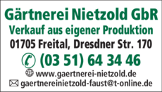 Die Adresse von Gärtnerei Nietzold GbR lautet: Dresdner Str. 170, 01705 Freital