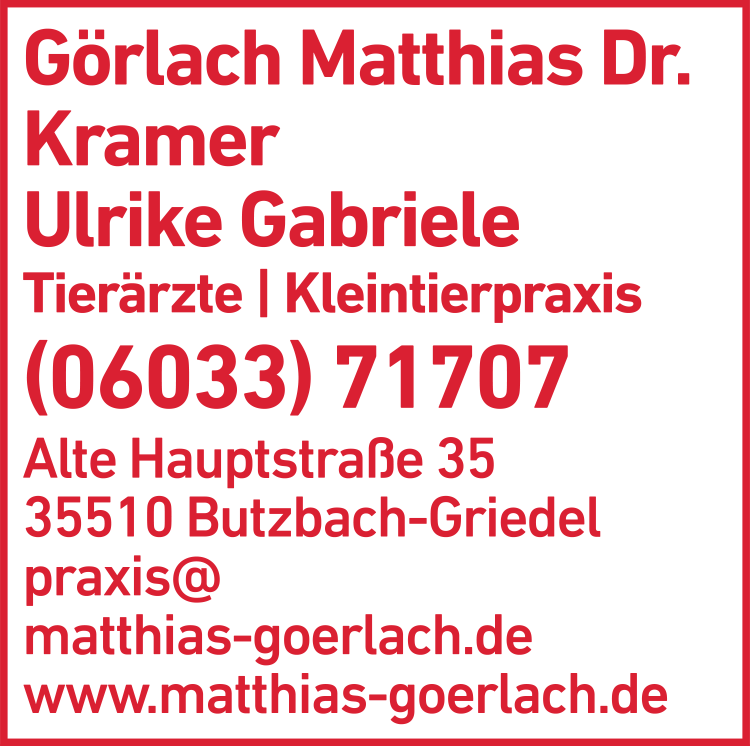 Görlach Matthias Dr. u. Kramer Ulrike Tierärzte 06033 7 17 07 Butzbach Alte Hauptstr. 35 35510 Griedel de.teleauskunft.oetb.webapp2.detail.Graphic@3f4b071d 5 5 2