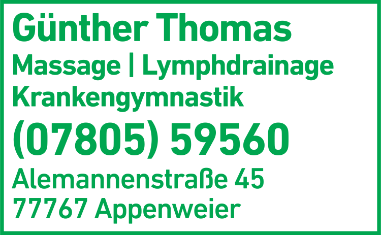 Die Adresse von Günther Thomas Praxis für Physiotherapie lautet: Alemannenstr. 45, 77767 Appenweier