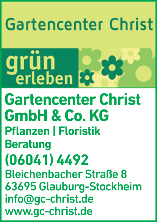 Die Adresse von Gartencenter Christ GmbH & Co. KG lautet: Bleichenbacher Str. 8, 63695 Glauburg