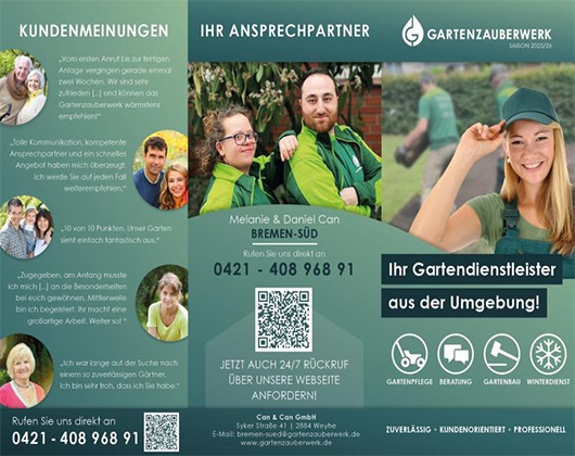 | Wir sind Melanie Can (gelernte Floristin) & Daniel Can (gelernter Gärtner). Ihre Profis aus der Region. Aus Liebe zur Natur und Interesse an Menschen haben wir uns mit einer eigenen Gartenzauberwerk-Filiale selbstständig gemacht. Egal in welchem Bereich Sie Beratung, Pflege oder Ideen benötigen: Bei uns sind Sie genau richtig. Wir unterstützen Sie gerne! |
