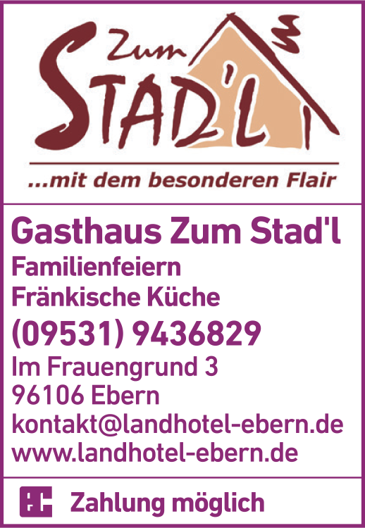Die Adresse von Gasthaus Zum Stad'l lautet: Im Frauengrund 3, 96106 Ebern