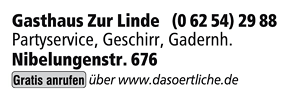Die Adresse von Gasthaus Zur Linde Partyservice, Geschirr, lautet: Nibelungenstr. 676, 64686 Lautertal (Odenwald)