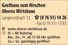 Waldau fährt, liegt kurz vor dem malerischen Schwarzwalddörfchen Waldau der Schwarzwaldgasthof " Zum Hirschen ". Bei den Einheimischen wird der Hirschen nur " das obere Wirtshaus " genannt, da er im oberen Teil des Langenordnachtales liegt. Das Obere Wirtshaus besteht seit nahezu 400 Jahren und besitzt aus dieser Zeit das Schankrecht. Untergebracht ist der Gasthof in einem typischen Eindachgebäude, wie sie im Schwarzwald üblich sind. Die urige und gemütliche Gaststube mit seinem grünen Kachelofen verbreiten sofort nach Betreten eine anheimelnde Atmosphäre und die herzliche Begrüßung der Wirtsleute tut ein übriges dazu. An Speisen werden regionale Gerichte und bodenständige Veper gereicht, die wunderbar angerichtet sind ( denn die Augen essen ja bekanntliche mit ) und vom Geschmack her gibt es auch keine Beanstandungen; ebenso stimmt nach meinem Dafürhalten das Preis-/Leistungsverhältnis. Besonders zu erwähnen sind die hervorragend gemachten Schnitzelgerichten in den unterschiedlichsten Variationen sowie die Wildspezialitäten aus den eigenen Wälder. An Getränken werden die guten Badischen Weine, sowie ein zünftiges Bier der badischen Staatsbrauerei aus Rothaus ( auch mehrere, wenn sie wollen ) sowie die üblichen alkeholfreien Getränke angeboten. Für Urlauber stehen Gästezimmer und Ferienwohnungen zur Verfügung und der Hirschen ist ein Refugium für Gäste, die die Ruhe suchen, im Frühjahr, Sommer und Herbst gerne wandern und im Winter auf den Langlaufloipen der näheren Umgebung ihr Vergnügen finden, Der alpine Skifahrer findet ebenfalls ein ausreichendes Liftangebot vor um seinem Hobby zu frönen.
