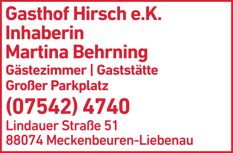 Die Adresse von Gasthof Hirsch e.K. lautet: Lindauer Str. 51, 88074 Meckenbeuren