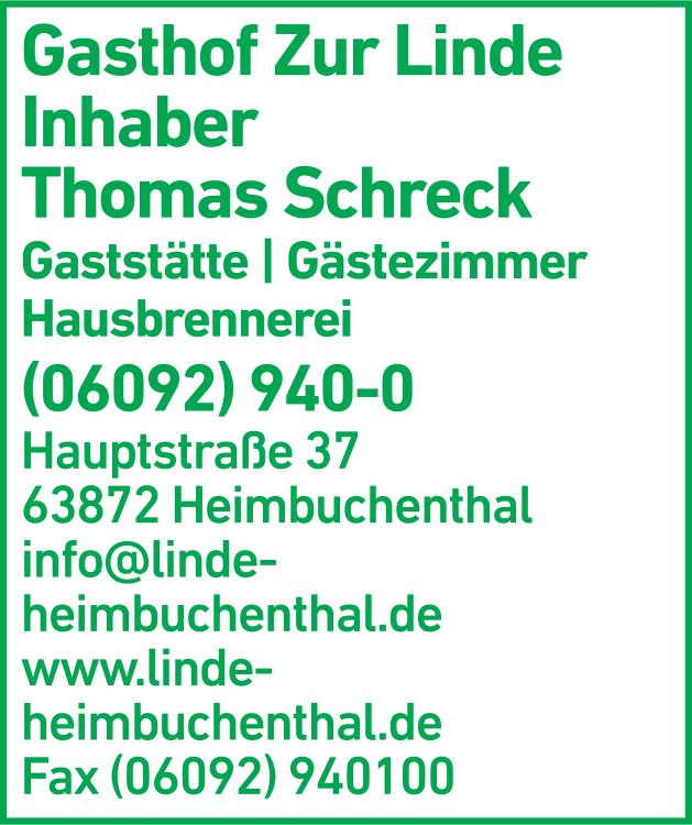 Die Adresse von Gasthof Zur Linde Inh. Thomas Schreck lautet: Hauptstr. 37, 63872 Heimbuchenthal