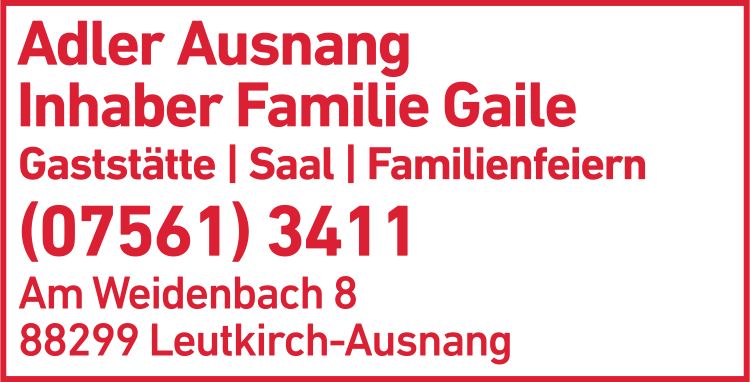 Die Adresse von Gaststätte Adler, Inh. Franz Gaile lautet: Am Weidenbach 8, 88299 Leutkirch