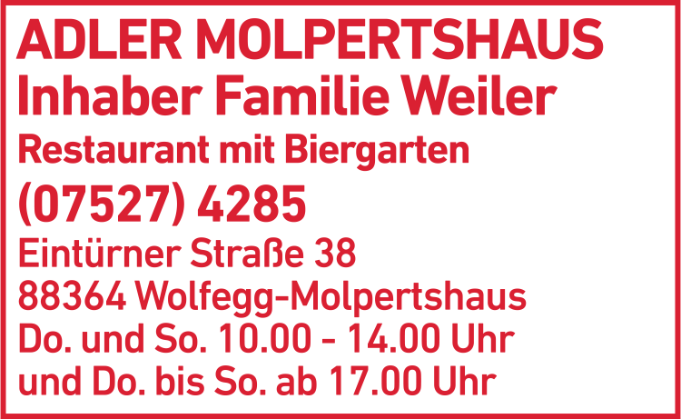 Die Adresse von Gaststätte Adler lautet: Eintürner Str. 38, 88364 Wolfegg-Molpertshaus