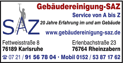 Gebäudereinigung und Autokosmetik SAZ 0721 91 56 78 04 Karlsruhe Fettweisstr. 8 76189 Daxlanden https://media.roeser-online.de/02/123/LOGO/000/174/853_200x100.png