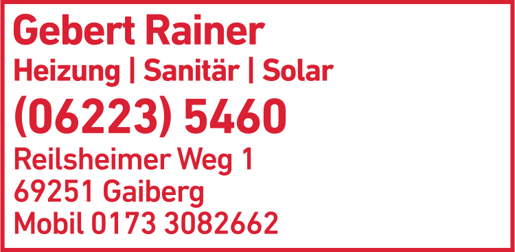 Die Adresse von Gebert Rainer Heizung - Sanitär - Solar lautet: Reilsheimer Weg 1, 69251 Gaiberg