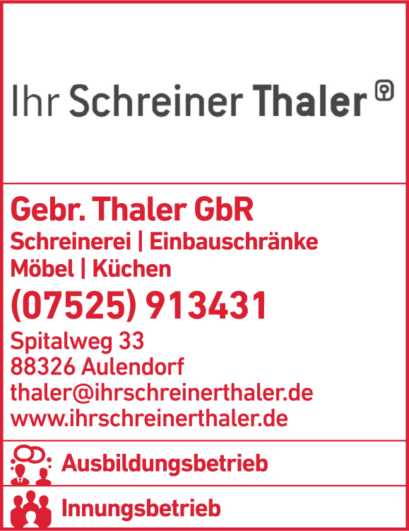 Die Adresse von Gebr. Thaler GbR Schreinerei u. Bestattungen lautet: Spitalweg 33, 88326 Aulendorf